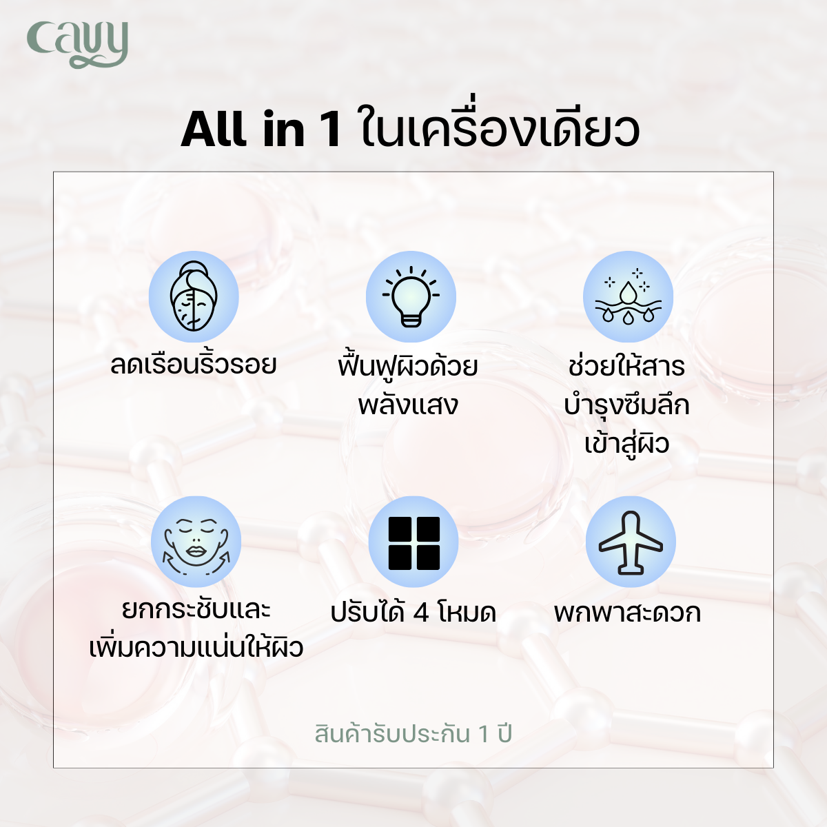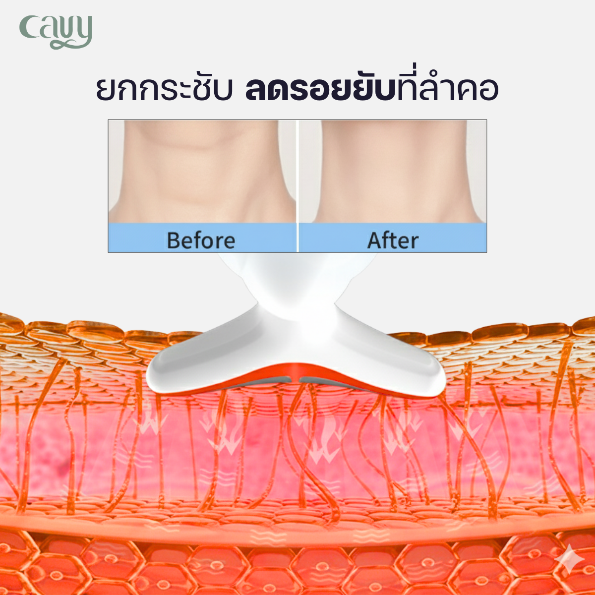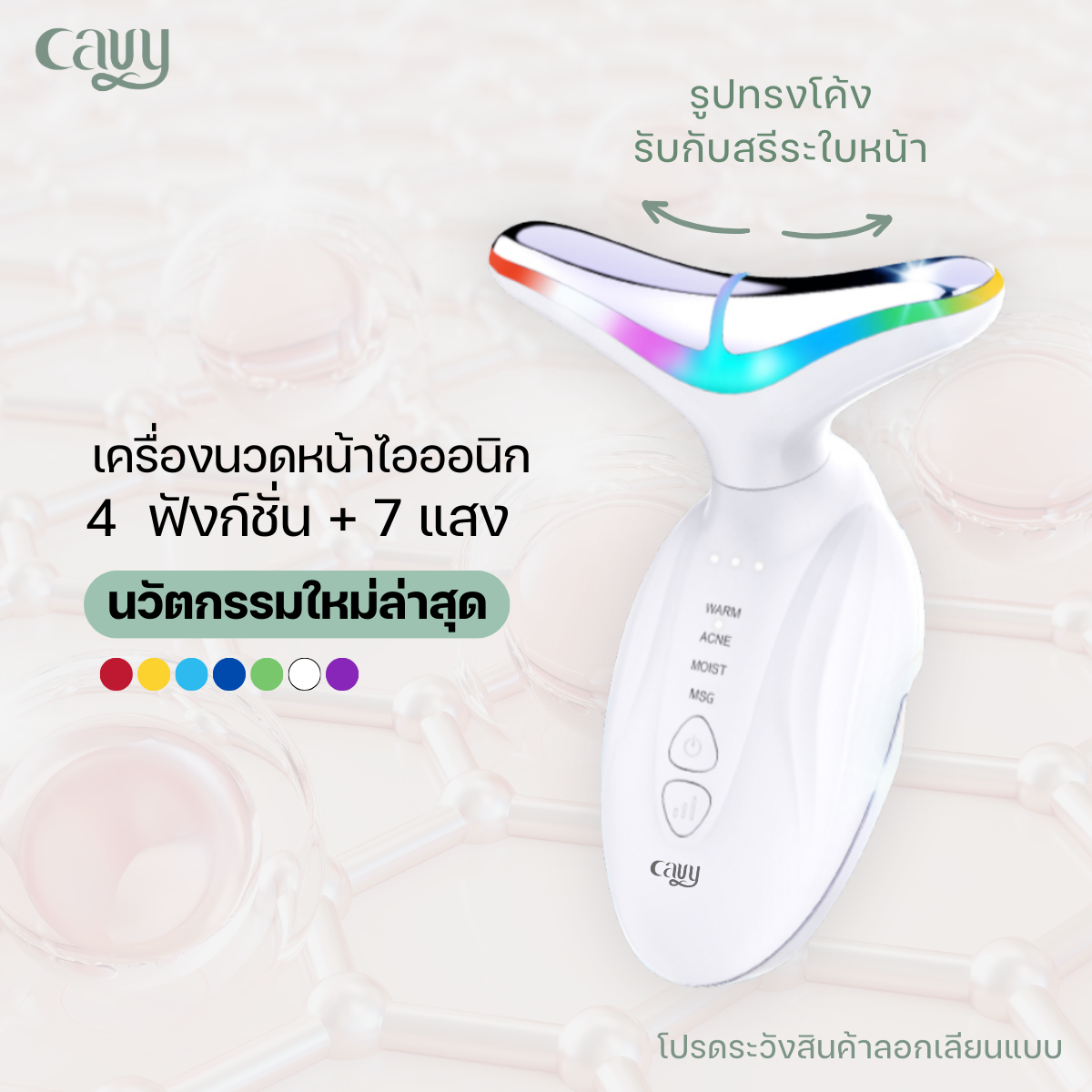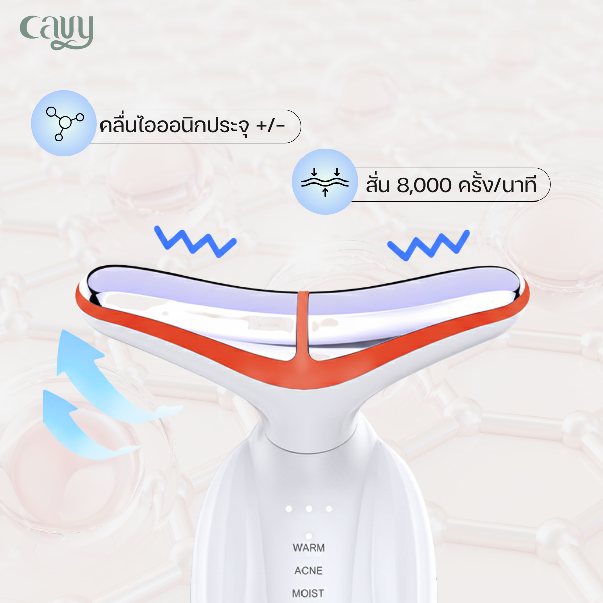 ตัวเครื่องมาพร้อมระบบ Bipolar current จะสั่นเมื่อสัมผัสผิว พร้อมแสง 7 สี ได้แก่ แดง เหลือง น้ำเงิน ฟ้า เขียว ขาว และม่วง ช่วยกระตุ้นการไหลเวียนโลหิต กระตุ้นจุดกดบนใบหน้าและลำคอ เปิดเส้นลมปราณ ส่งเสริมระบบการเผาผลาญให้ทำงานได้ดีขึ้น เพื่อให้ผิวใส ลดริ้วรอยที่ลำคอ ลดอาการบวม ผ่อนคลายไหล่–คอ และช่วยคลายความเหนื่อยล้าอย่างรวดเร็ว พร้อมเติมพลังงานให้ร่างกายกลับมาสดชื่น